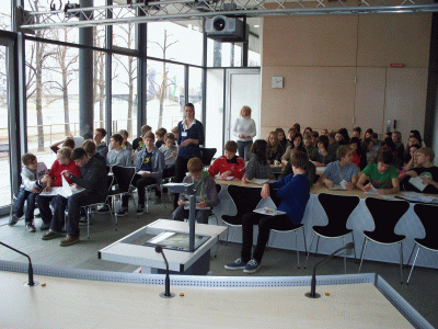 Das und noch härtere Maßnahmen in solchen Fällen erklärte uns Frau Panndorf genauer nach unserem Aufenthalt in der Plenarsitzung am Beispiel von H. Apfel (NPD) im Jahr 2010. Außerdem erfuhren wir noch interessante Dinge über die Aufgaben des Präsidenten, der Fraktionen und die Wege eines Gesetzes.