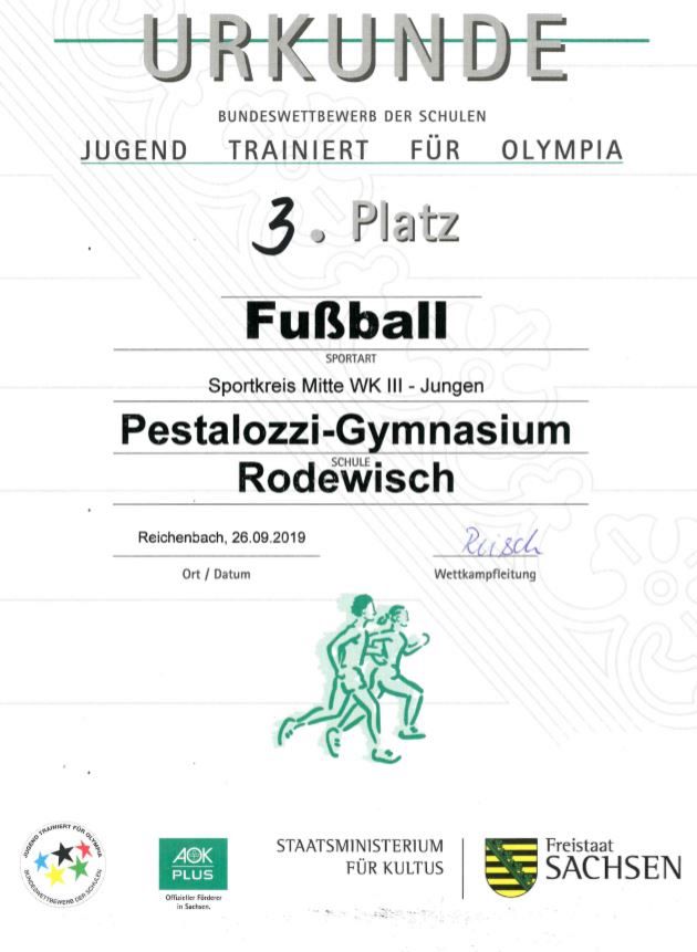 Am Donnerstag, den 26.09.19, nahmen 14 Schüler des Pestalozzi-Gymnasiums im Rahmen des Bundeswettbewerbs Jugend trainiert für Olympia am Sportkreisfinale Fußball der Wettkampfklasse 3 (Klassen 7/8) in Reichenbach teil. Nach einem Sieg (2:0, Torschützen Niclas und Paul) und einer Niederlage (0:2) in der Vorrunde erreichten wir als zweitplatzierte Mannschaft der Gruppe das Halbfinale, welches leider mit einer 0:3-Niederlage endete. Im abschließenden Spiel um Platz 3 erzielte Moritz mit einem sehenswerten Kopfballtreffer das einzige Tor und sicherte damit unserer Mannschaft einen hervorragenden 3. Platz in diesem Turnier.