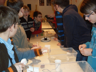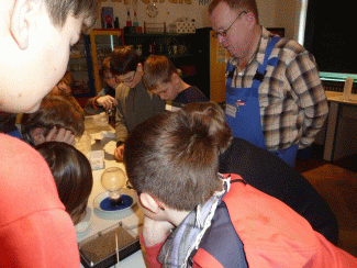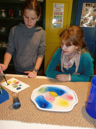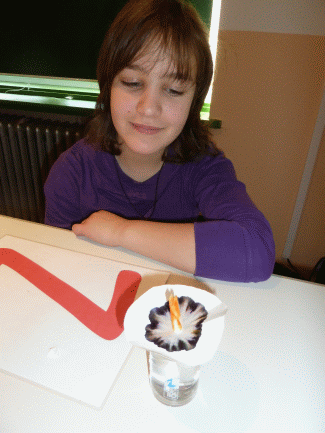 Besonders schön empfanden wir es, dass wir zum Workshop den neu gestalteten Raum im Museum einweihen durften. Als Ergebnisse des Workshops haben wir entweder einen selbst gebauten „Faschenteufel“ oder die Eigenkreation einer Blüte mit nach Hause genommen. In diesem Zusammenhang haben wir uns mit dem Auftrieb in Flüssigkeiten und mit Chromatografie befasst.