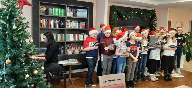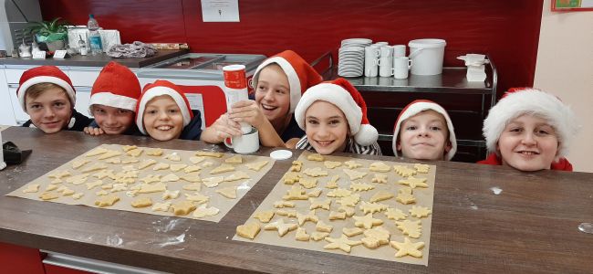 Während der Plätzchenbäckerei erklangen viele schöne Weihnachtslieder, die auch gern an den Tischen mitgesungen wurden. Dafür sorgten unsere Musiktalente unter Begleitung von Frau Tauchert-Knoll.