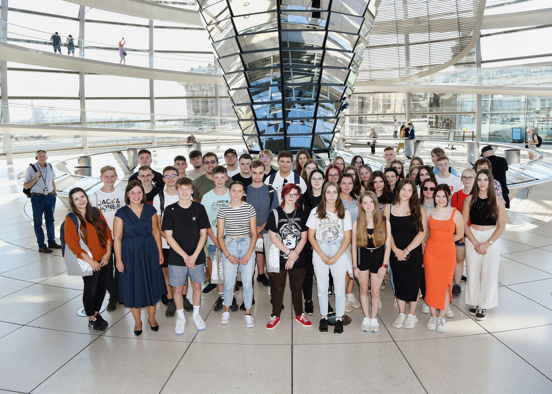 Besuch im Bundestag Am 06.09.2023 besuchten die beiden GRW-Kurse der Jahrgangsstufe 12 gemeinsam mit den beiden GRW-Lehrerinnen Frau Rockstroh und Frau Lubjuhn den Deutschen Bundestag in Berlin. Mit dem Bus ging es 8 Uhr Richtung Hauptstadt. Nach erfolgreicher Sicherheitskontrolle war es endlich soweit und dem Besuch stand nichts mehr im Wege. Alle Schülerinnen und Schüler erhielten ein Band mit der Aufschrift „Tribüne“, welches uns erlaubte, eine Stunde lang bei einer Plenarsitzung im Plenarsaal zuzuhören und zuzuschauen. Auf der Tagesordnung stand die Arbeit des Auswärtigen Amtes, worüber die Abgeordneten Debatten führten. Zunächst hielt Annalena Baerbock, die derzeitige Außenministerin und erste Frau, die an der Spitze des Auswärtigen Amtes steht, eine Rede über die aktuelle Situation in der Ukraine und wie eine Unterstützung für die vielen zerstörten Schulen ermöglicht werden soll. Danach folgten weitere Reden von den Abgeordneten der Fraktionen, welche sich zum Teil sehr kritisch über die Arbeit des Auswärtigen Amtes äußerten. Die Schülerinnen und Schüler sahen auch das ein oder andere bekannte Gesicht, unter anderem Bundeskanzler Olaf Scholz, Vizekanzler und Bundesminister für Wirtschaft und Klimaschutz Robert Habeck und Bundestagsmitglied Philipp Amthor. Nach der Plenarsitzung erfolgte ein einstündiges Gespräch mit der Vizepräsidentin des Deutschen Bundestages Yvonne Magwas. Nachdem sie sich und ihre Aufgaben als Vizepräsidentin vorgestellt hat, durften wir Schülerinnen und Schüler Fragen rund um das Thema Politik stellen, die sie sehr ausführlich beantwortete. Zur Erinnerung an diesen Tag wurde auf der Kuppel des Bundestages noch ein Foto mit Frau Magwas geschossen. Anschließend war es uns möglich, etwas Zeit auf der Kuppel und in der Stadt zu verbringen, bevor es wieder Richtung Heimat ging. Auf dem Rückweg sind wir noch am Schloss Bellevue, dem Amtssitz des derzeitigen Bundespräsidenten Frank-Walter Steinmeier, vorbeigefahren. Den Tag haben wir mit einem Sonnenuntergang abgeschlossen. Siya Fritzsch