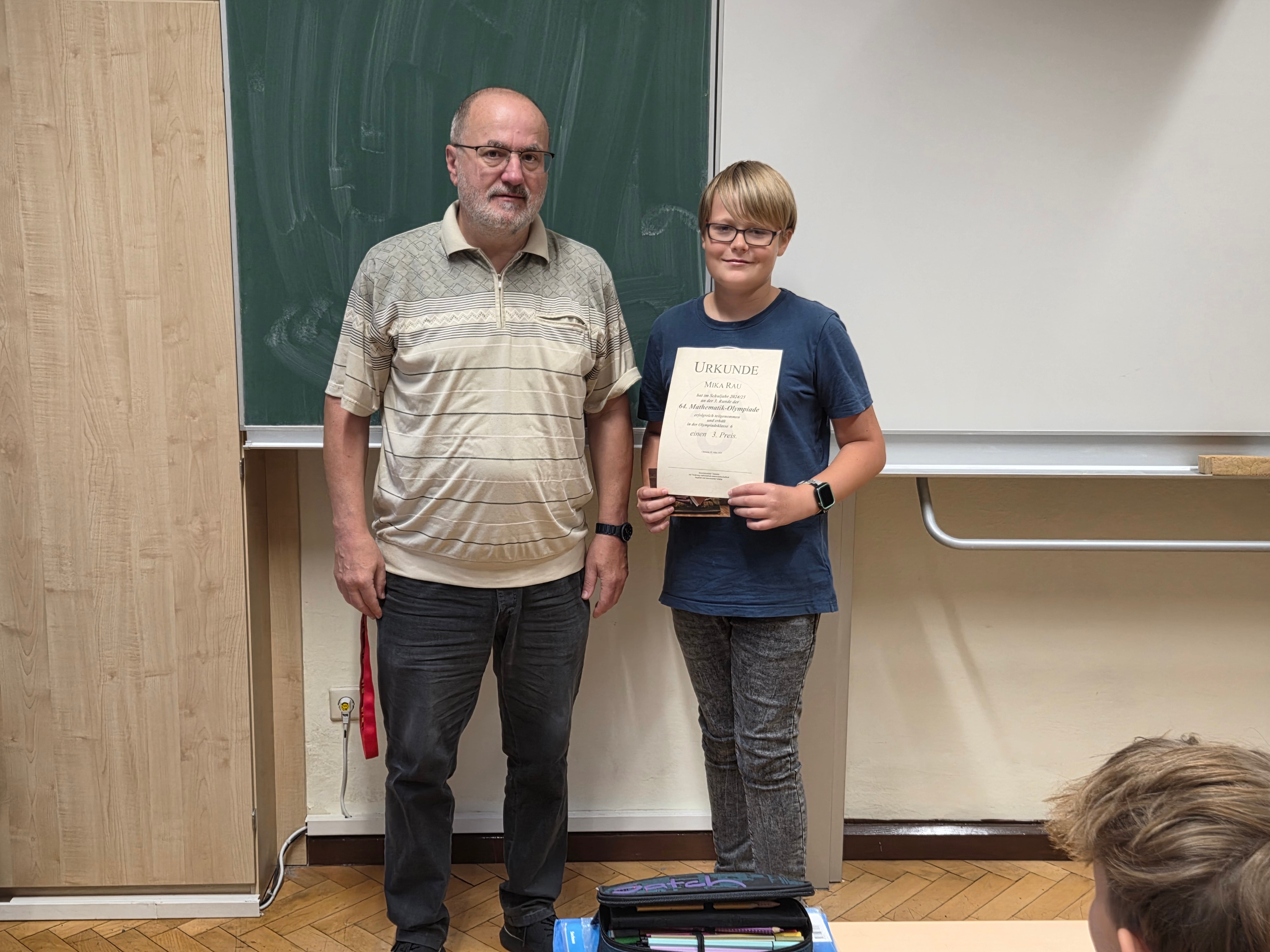 Erfolgreiche Teilnahme an der 64. Mathematikolympiade – 79 junge Mathetalente starten durch! Auch in diesem Jahr zeigten unsere Schülerinnen und Schüler wieder beachtliches mathematisches Können bei der 64. Mathematikolympiade. Insgesamt 79 Mädchen und Jungen nahmen erfolgreich an der 1. Stufe des Wettbewerbs teil – als beste Mathematikerinnen und Mathematiker ihrer Klassen. Mit viel Engagement, logischem Denken und Ausdauer stellten sie sich den anspruchsvollen Aufgaben und bewiesen, dass mathematisches Talent an unserer Schule großgeschrieben wird. Besonders erfreulich ist, dass 36 dieser Teilnehmenden sich für die 2. Stufe der Olympiade qualifizierten und dort als beste Vertreterinnen und Vertreter unserer Schule im Regionalwettbewerb Vogtland an den Start gingen. Diese Schülerinnen und Schüler repräsentierten unsere Schule mit Stolz und beeindruckten durch ihre tiefgehende mathematische Denkweise und Problemlösekompetenz. Ein ganz besonderes Lob gilt auch den sogenannten Frühstartern aus den 4. Klassen der Grundschule, die sich mutig den Herausforderungen stellten und mit ihren Leistungen zeigten, dass man nie zu jung ist für große Denkleistungen. Ihr Einsatz und ihre Begeisterung für die Mathematik sind inspirierend und ein echtes Vorbild für kommende Jahrgänge. Ein Höhepunkt der diesjährigen Mathematikolympiade waren die Leistungen von Jamie Luc Gottschald und Mika Rauh, die sich für die 3.Stufe der Matheolympiade in Chemnitz qualifizieren konnten. Mika Rau konnte sich in der 3. Stufe des Wettbewerbs gegen eine starke Konkurrenz behaupteten und einen hervorragenden 3. Platz belegen. Diese Platzierung ist eine besondere Anerkennung seines außergewöhnlichen mathematischen Talents und seines engagierten Einsatzes – herzlichen Glückwunsch, Mika! Wir gratulieren allen Teilnehmerinnen und Teilnehmern, würdigen die Preisträgerinnen und Preisträger und danken ihnen für ihre Begeisterung, ihren Fleiß und ihre Neugier im Umgang mit mathematischen Herausforderungen. Die Mathematikolympiade ist mehr als ein Wettbewerb – sie ist ein Ort, an dem logisches Denken, Kreativität und Ausdauer zusammenkommen. Wir freuen uns schon jetzt auf die nächste Runde! Herzlichen Glückwunsch an alle Talente von ihren Mathelehrern! Unsere Preisträger der 2.Stufe Frühstarter Kürschner, Ben Schiller-GS Platz 1 Döhler, Amalia GS Steinberg Platz 2 Görler, Joel GS Steinberg Platz 3